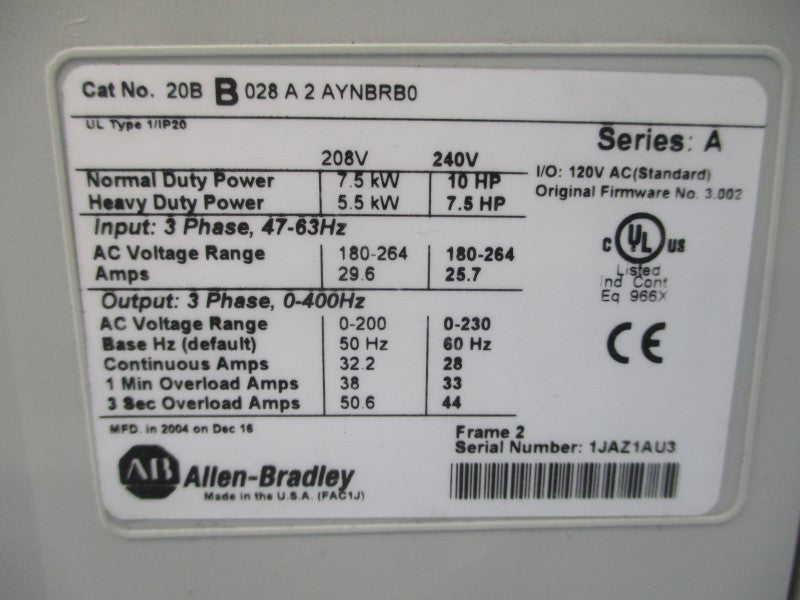 DRIVE, SER. A, F/W 3.002, 240VAC, 25.7A