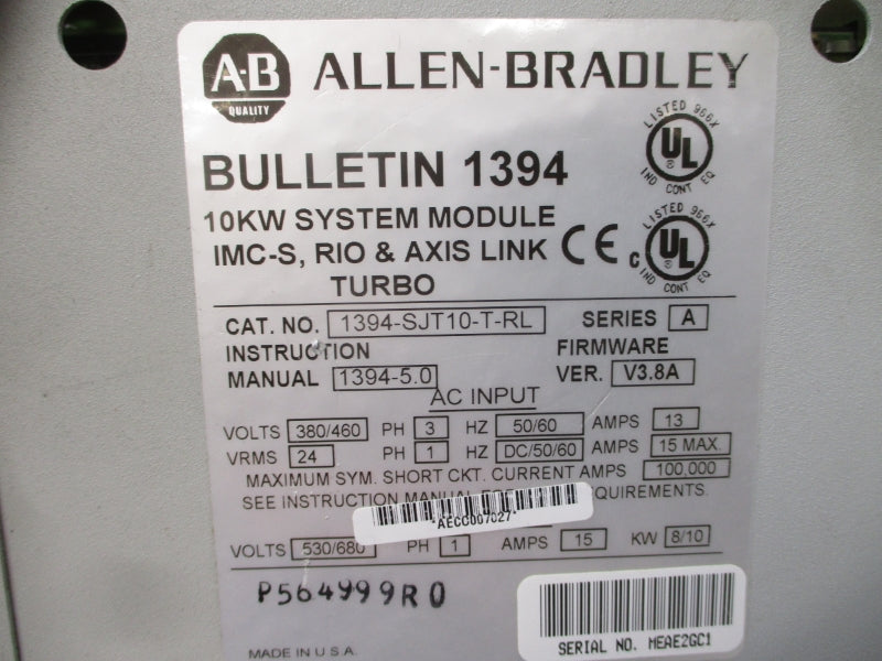 ALLEN BRADLEY 1394-SJT10-T-RL SER. A F/W V3.8A 380/460VAC 13A (AS PICTURED) UNMP