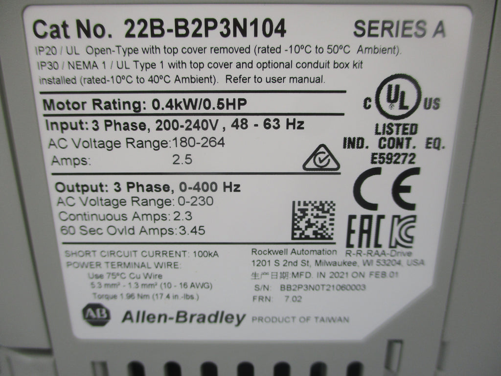 ALLEN BRADLEY 22B-B2P3N104 SER. A 180-264VAC 2.5A F/W 7.02 NSMP