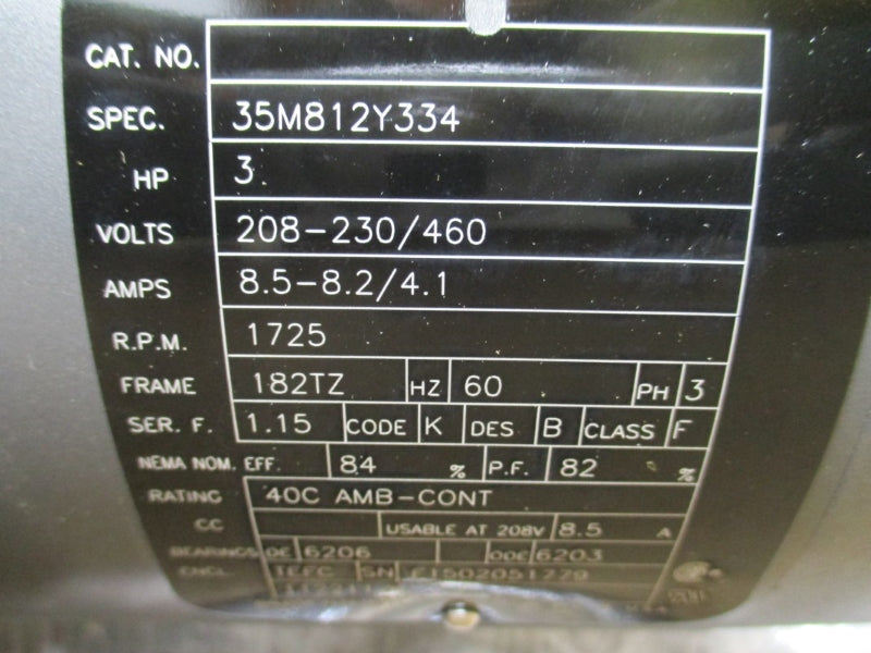 BALDOR 35M812Y334 3 HP 182TZ 1725 RPM 208-230/460V 8.5-8.2/4.1A NSMP